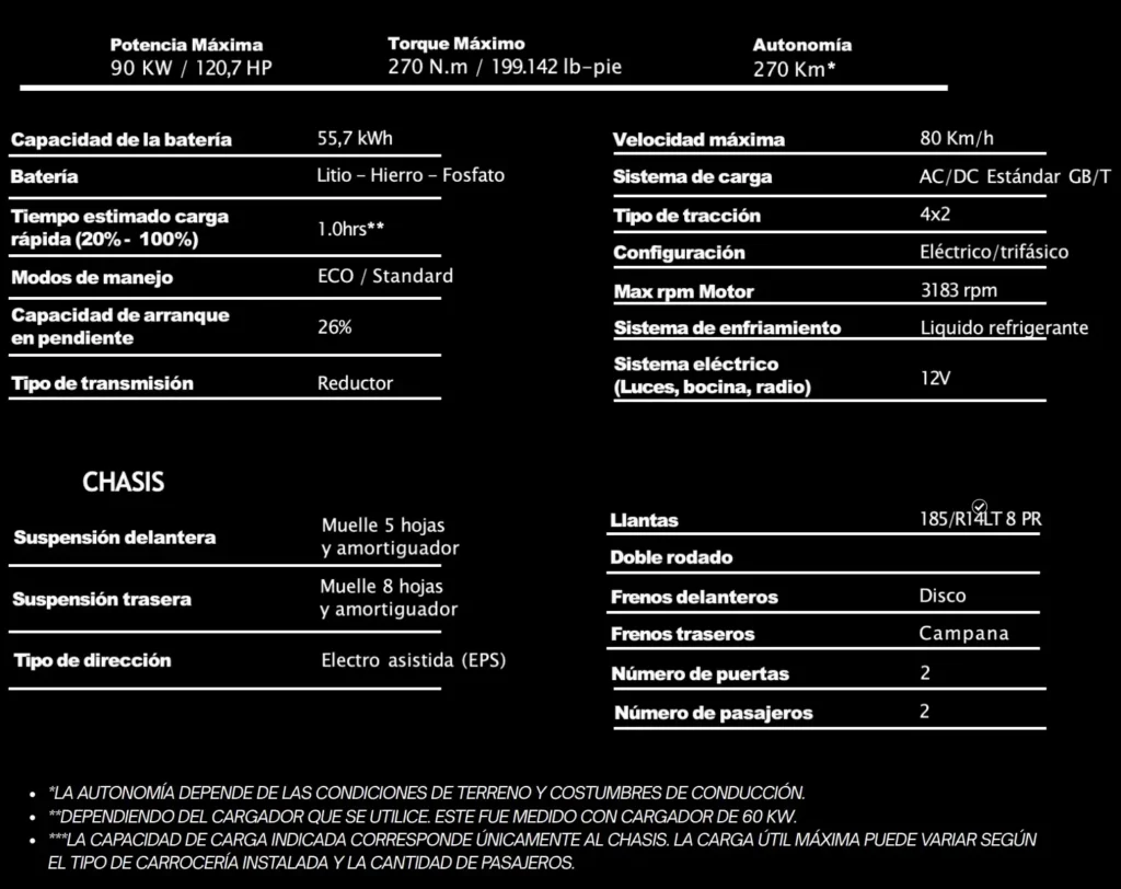 Carga Flexible y Equipada: Sistema de carga AC/DC estándar GB/T. Con un cargador rápido de 60 kW, recuperas del 20% al 100% en aproximadamente 10 horas. Equipado con aire acondicionado, pantalla multimedia y cámara de reversa.