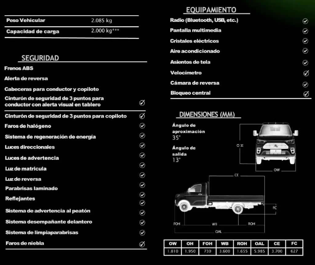 Visibilidad y Control: Faros de niebla, sistema desempañante, cámara de reversa con alerta acústica, parabrisas laminado y llantas 185/RL4LT 8 PR de doble rodado para mayor resistencia.